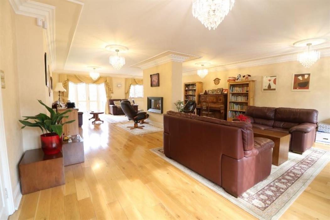 Spacious room having chandeliers to ceiling, panelled radiators, feature chimney incorporating glass gas fire, hardwood flooring, upvc doors to the rear elevation leading to the garden, a double glazed window to the rear elevation and a double glazed bay window to the front elevation.