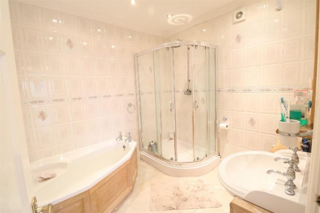 Having ceiling light points, panelled radiator, ceramic splash back wall tiles, two hand wash basins with vanity units, corner bath tub with hot and cold taps over also electric shower over, fitted carpet and an obscure double glazed window to the rear elevation.