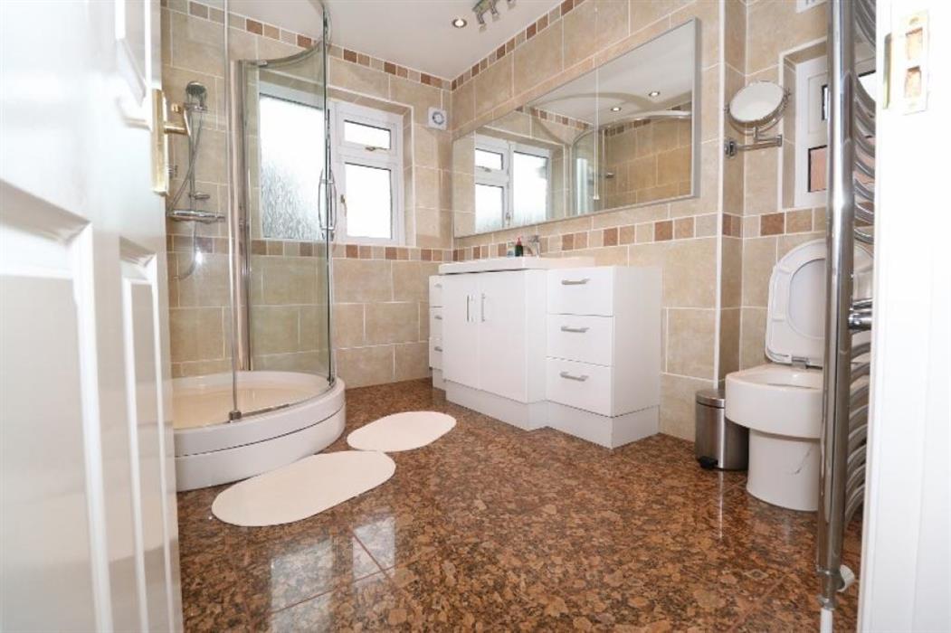 Having several spotlights, heated towel rail, hand wash basin with vanity unit, shower cubicle, ceramic splash back wall tiles, concrete flooring and obscure double glazed windows to the side and rear elevations.