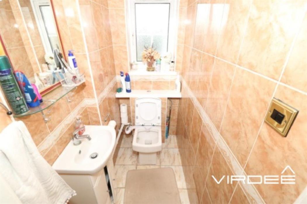 Having a ceiling light point, toilet, hand wash basin with vanity unit, ceramic splash back wall tiles, tiled flooring and an obscure double glazed window to the rear elevation.