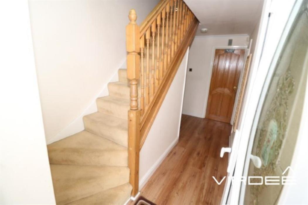 Having a ceiling light point, stairs leading to the first floor, under stair storage and laminate flooring.