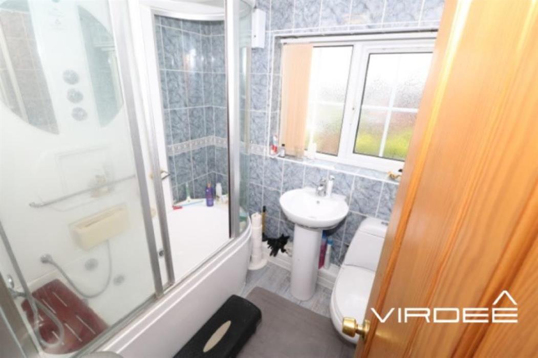 Having several spotlights, hand wash basin with vanity unit, curved shower cubicle with jets, sliding glass door for storage, ceramic splash back wall tiles, tiled flooring and a double glazed window to the rear elevation.